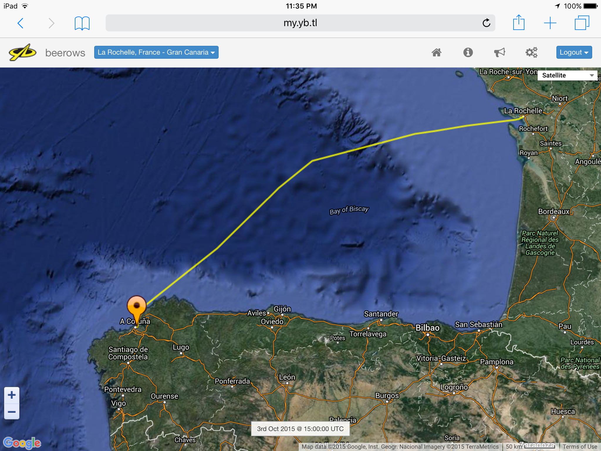 As you can see from the tracker we just traveled from La Rochelle, France to La Coruna, Spain. You can follow Sea Rose anytime on the tracker at; http://my.yb.tl/beerows/